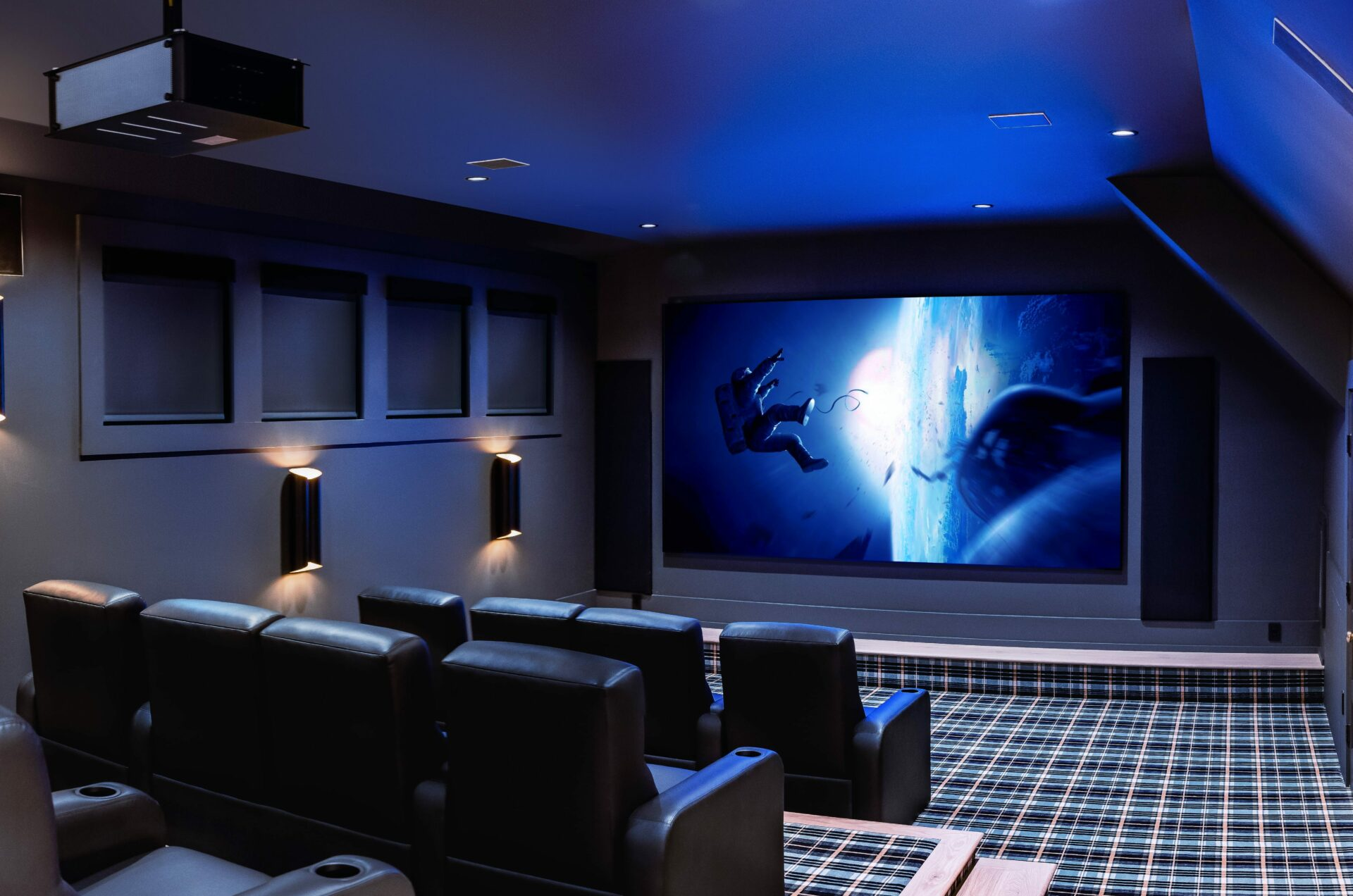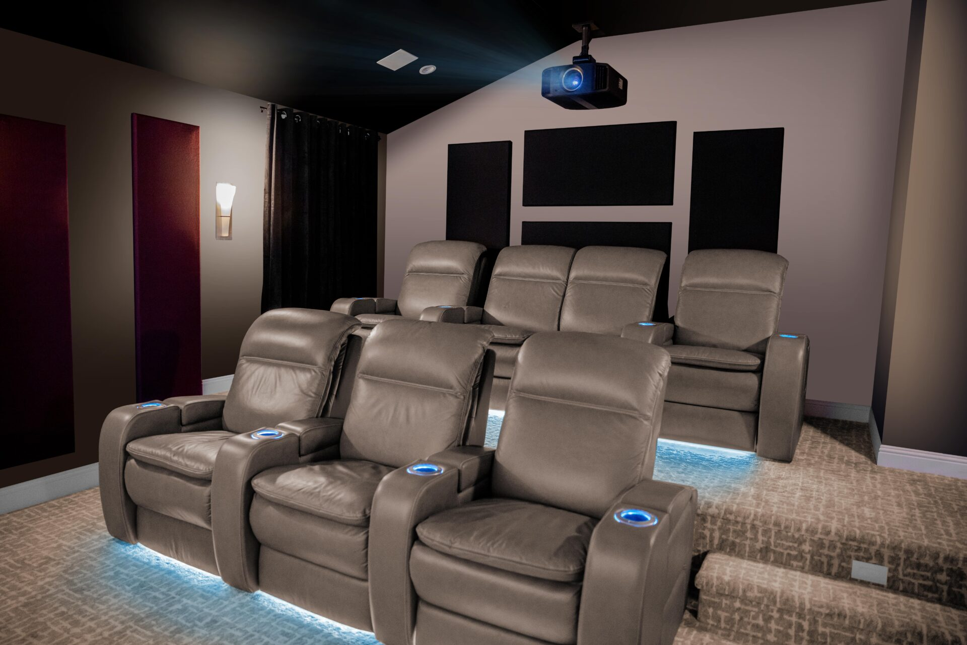 Smart lighting balances visibility and atmosphere while maintaining an immersive movie experience.